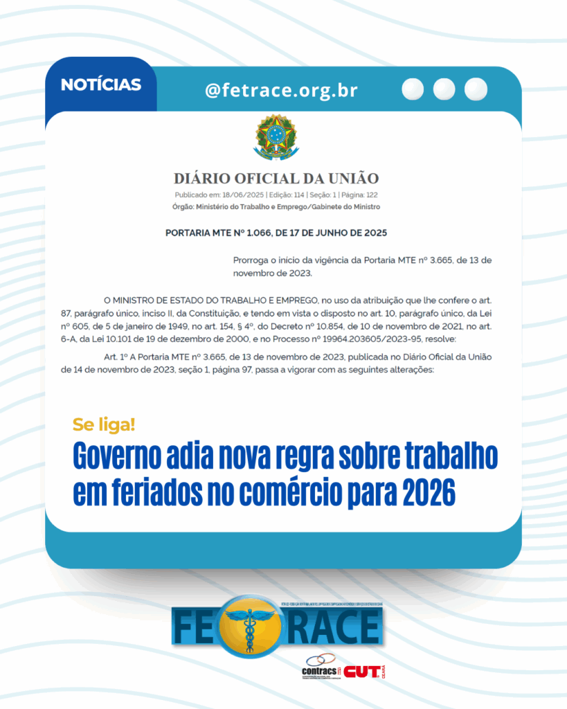 Discute o fim da escala 6×1 e a Portaria nº 3.665/2023 A Federação dos Trabalhadores, Empregados e Empregadas no Comércio e Serviços do Estado do Ceará […]